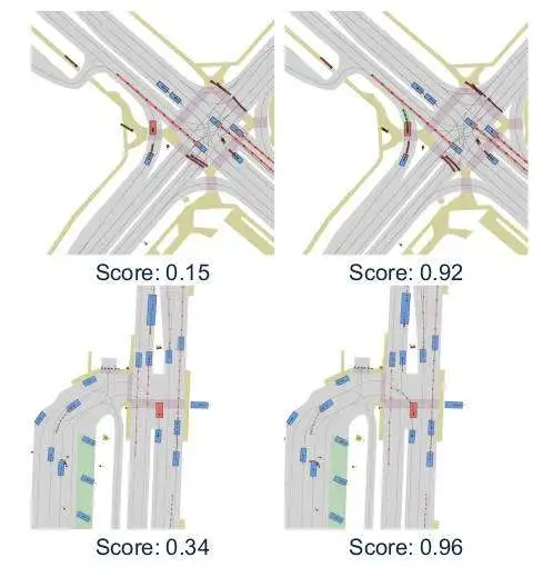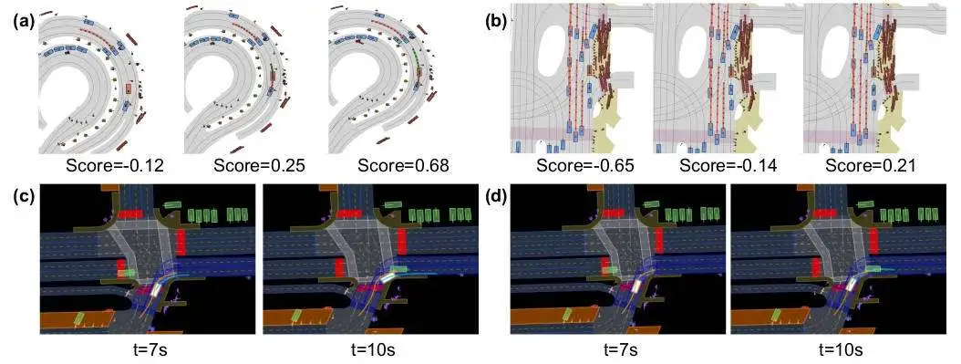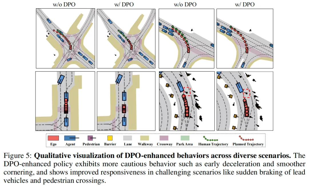 此外,为了更加直观的展示生成过程中的一些典型场景,微调后的策略表现出更好的规划性能,我们也进行了相关的可视化。