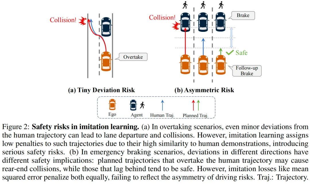 - 第二,模仿学习中常用的对称损失(如均方误差)会对两个方向的偏差施加同等的惩罚,但不同方向的偏差对安全性的影响差异极大(见图2b)。因此仅通过模仿学习训练的策略往往会生成看似合理、但在实际驾驶场景中存在安全风险的行为。