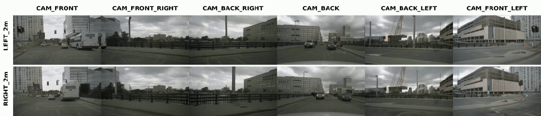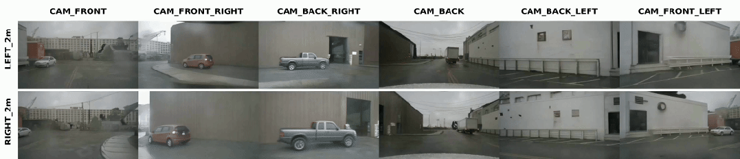 基于FreeVS的自车姿态扰动策略,我们通过横向偏移车辆路径生成一组新轨迹。具体而言,给定原始自车轨迹,沿车辆y轴施加的偏移量,生成6条扰动轨迹。对于每条扰动路径,聚合后的4D高斯分布可渲染出高保真新视角视频。