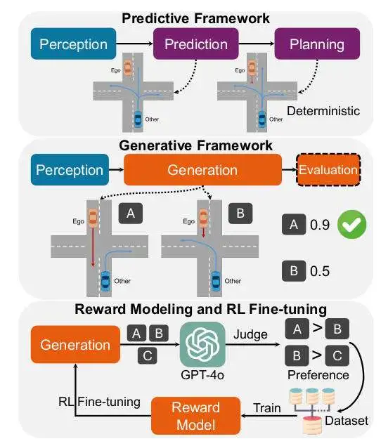 与受益于样本多样性的仿真或者场景生成任务不同,使用生成模型进行规划需要用更少的样本生成更可能的未来场景,以最大限度地减少计算开销和运行时延迟。我们通过引入强化学习 (RL) 微调框架来解决这个问题,该框架基于获得的奖励模型来提高扩散生成的质量;