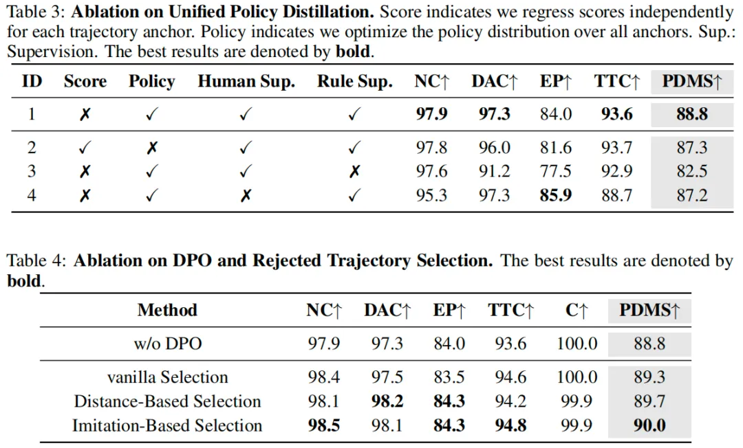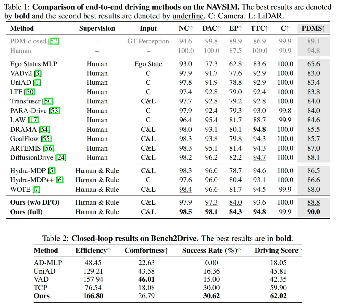 为了解决上述的问题,中科院的团队提出了DriveDPO - 一种基于safety DPO的策略学习框架。首先从人类模仿相似度和基于规则的安全分数中提炼出统一的策略分布,用于直接的策略优化;其次,引入迭代式DPO,将其构建为轨迹级别的偏好对齐任务。在NAVSIM基准数据集上的大量实验表明,DriveDPO实现了90.0的最新最优PDMS。此外在多种复杂场景下的定性结果进一步证明,DriveDPO能够生成更安全、更可靠的驾驶行为。
