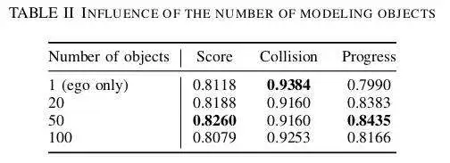 首先,我们先分析了建模目标数量的影响。数量范围从 1到 100,相关的实验结果下表所示。我们在模型训练中调整建模目标的数量,并在测试中使用单样本生成。结果表明,仅生成自车的规划会导致性能较差,主要是因为在某些情况下缺乏运动。相反,过多的建模目标(例如 100)也会导致性能和运行效率下降。因此,在保持运行效率的同时,对 50 个自车和周围对象进行建模表现最佳。