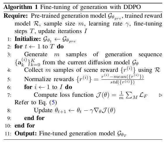 - 训练过程:在每个训练步骤中,我们从相同的初始条件中采样一批成对比较结果,即接受的场景和拒绝的场景。训练场景评估模型的损失函数如下,其中,是成对偏好奖励数据集,表示预测生成场景得分的奖励模型。