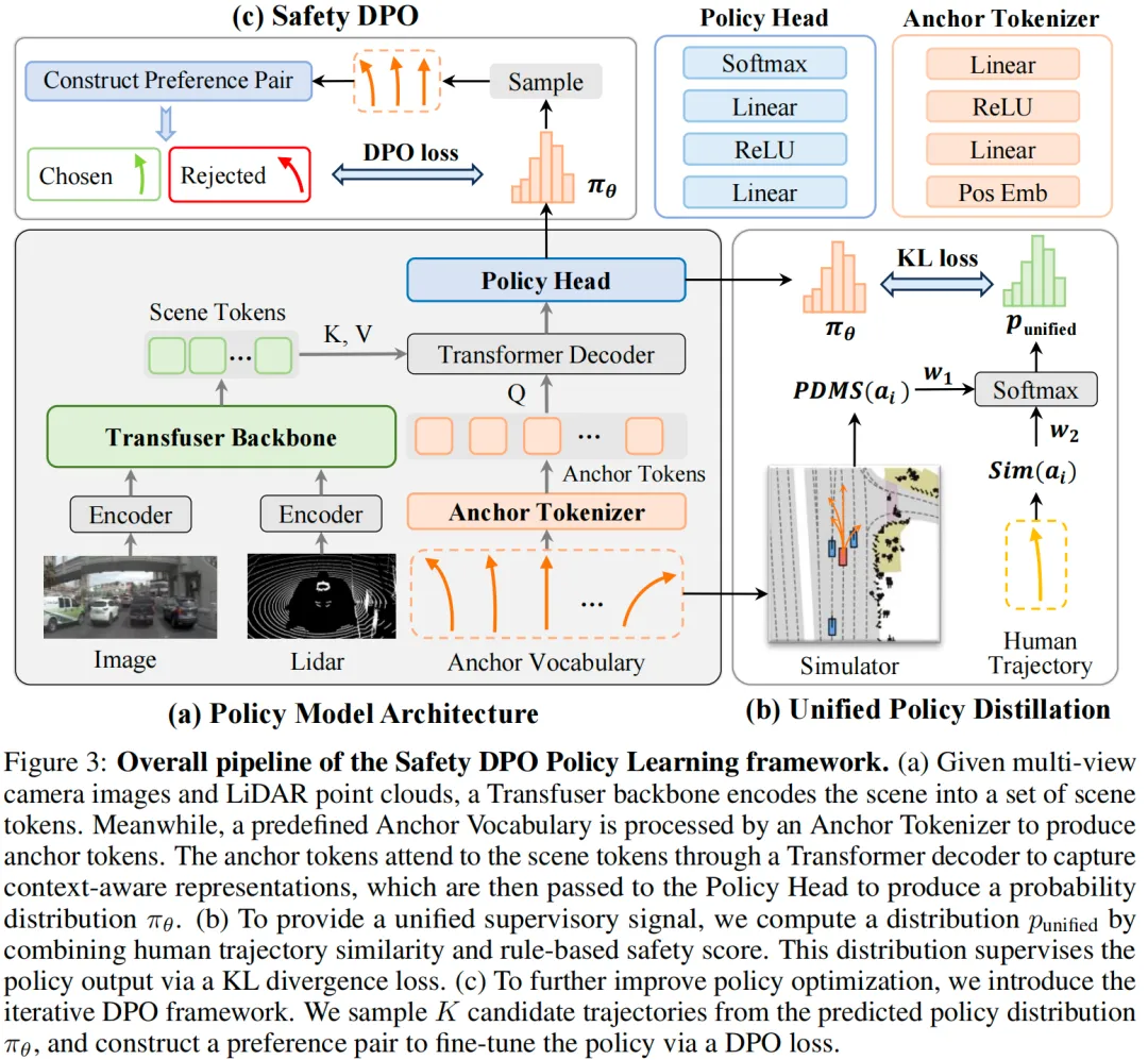 通过"统一策略蒸馏"得到预训练策略后,由于同时存在模仿与安全信号的联合监督,会引发多目标优化问题。为缓解该问题,本文采用迭代式DPO框架,提出"安全直接偏好优化(Safety DPO)":通过明确优先选择"既符合人类驾驶习惯又安全"的轨迹、抑制"看似符合人类驾驶习惯但存在风险"的轨迹,进一步优化策略。
