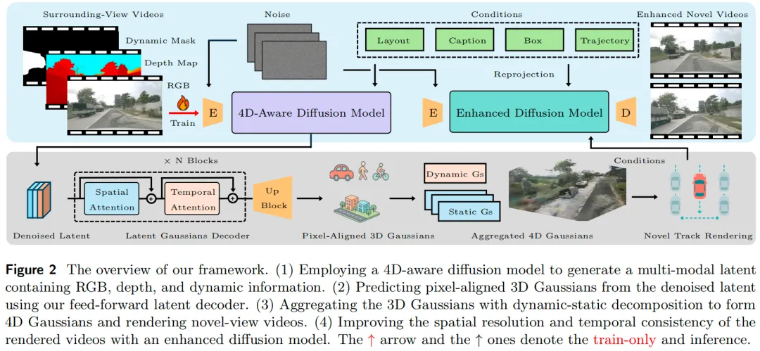 推理时,4D感知扩散模型以噪声潜变量与控制条件C为输入,输出去噪潜变量;高斯解码器从中预测4D高斯分布,再基于自定义自车轨迹渲染新视角视频。随后,将草图与边界框重投影为与,形成新控制条件。增强型扩散模型以噪声潜变量与为输入,对进行优化,最终生成高保真新视角视频。