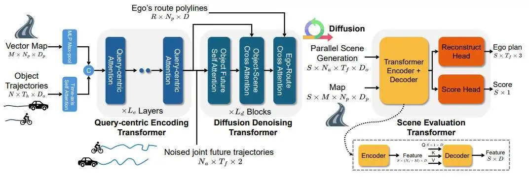 场景评估器将扩散生成器生成的个未来场景作为输入,这些场景可以通过从一批高斯噪声开始并行生成。这些生成的场景结构化为,评估器的另外一个输入是矢量地图。这些未来场景使用以查询为中心的Transformer编码器进行编码,类似于历史场景的编码,从而产生场景特征表示。随后,我们利用从场景编码中提取的自车代理的未来或规划编码,以及将场景编码作为Transformer解码器中的键和值,得出未来场景中以规划为中心的特征。需要注意的是,Transformer解码器分别关注每个场景中的个元素。两个多层感知机头模块附加到这个特征张量用于分别重建自车代理的规划轨迹并输出不同生成场景的分数。自车规划重建的头模块作为辅助任务来增强稳定性和有效性。