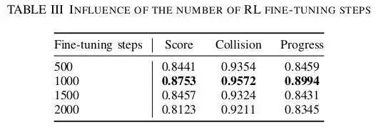 此外,我们也对RL微调阶段训练步骤对结果的影响进行了实验,并在测试中采用了多样本生成和评分方法,相关实验结果如下表所示。结果表明,1000 个微调步骤可实现最佳规划指标,超过此指标,微调策略的性能就会下降。这是 RLHF 框架中的一个常见问题,因为策略可能会利用奖励函数并产生不合理的行为。因此,我们将 RL 微调阶段限制为 1000 个步骤,以防止性能下降。