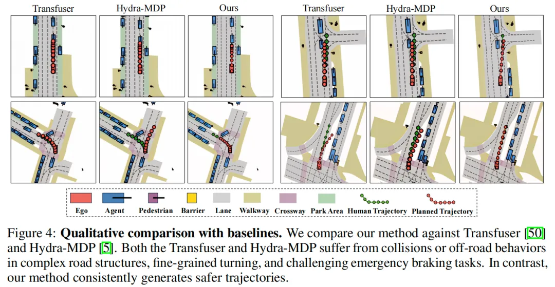 首先,本文方法依赖PDMS指标作为安全评估的核心标准。虽然PDMS整合了多个维度的评估内容(包括避撞、可行驶区域合规性、自车进度、碰撞时间和舒适性),但它本质上仍是一种预定义的加权复合指标,无法完全捕捉复杂驾驶场景中所有潜在的风险因素。未来的研究可探索更具表达性和灵活性的轨迹评估指标,以构建更全面的安全评估机制。