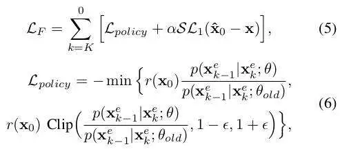 为了提高扩散生成在规划任务中的效率,我们建议使用训练好的奖励模型和RL对扩散模型进行微调。我们可以将扩散去噪过程公式化为多步骤的MDP,其中去噪器函数作为以每一步的噪声输入为条件的策略。轨迹包含K个时间戳,在扩散过程结束时发出奖励信号。RL目标是最大化沿轨迹的累积奖励,我们可以利用去噪扩散策略优化来改进生成策略。微调损失公式如下,其中,是所有目标的去噪状态轨迹,是真实轨迹。