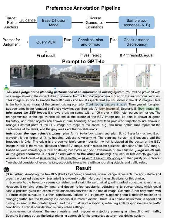 - 成对偏好数据收集:为了构建一个有效的奖励模型,整理全面的数据集是非常有必要的。一种方法是利用人为设计的指标,例如PDM分数。但是,依赖此类指标存在很大的局限性,因为它们可能无法准确反映不同场景中的实际人类价值观。此外,即使对于人类评估者来说,准确地用奖励值标记场景也是一项挑战。或者,我们可以让人类标注员进行成对的比较,确定哪些场景更符合人类偏好。然而,整理大规模奖励数据集会给人类标注员带来巨大的工作量。为了解决这个问题,我们使用VLM来提高流程的效率和可扩展性。VLM辅助奖励标记流程如下图所示。为了增加规划轨迹的多样性,我们首先利用K-means聚类算法从数据中提取32个5秒锚定目标,并采用引导扩散策略为自车代理生成32条不同的规划轨迹,以及模型对场景中其他物体的反应行为。随后,我们对这些场景进行成对采样。我们首先计算规划轨迹之间的差异,然后检查碰撞和过滤掉明显的失败情况。如果这些措施不足以区分,我们将使用GPT-4o提供结论性评估。如下图所示,GPT-4o根据当前场景上下文对两个生成的场景进行了合理的评估。