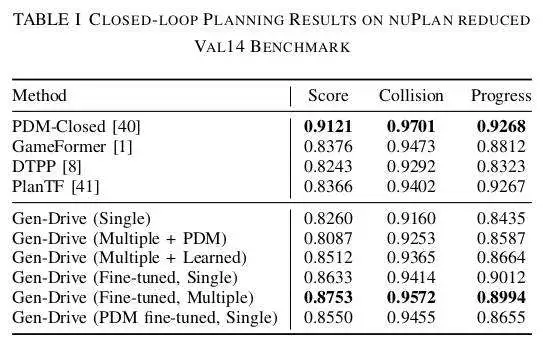 为了验证我们提出的算法模型的有效性,我们实施了不同模型的闭环规划实验,结果如下表所示。