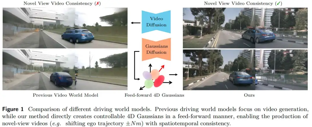 在本研究中,我们提出了WorldSplat------一种全新的前馈式框架,该框架整合了生成式方法与重建式方法的优势,用于4D驾驶场景合成。通过将4D感知潜在扩散模型与增强型扩散网络相结合,我们的方法能够生成显式4D高斯分布,并将其优化为高保真、具备时间与空间一致性的多轨迹驾驶视频。在标准基准数据集上开展的大量实验证实,WorldSplat在真实感与新视角质量方面均优于现有的生成技术与重建技术。