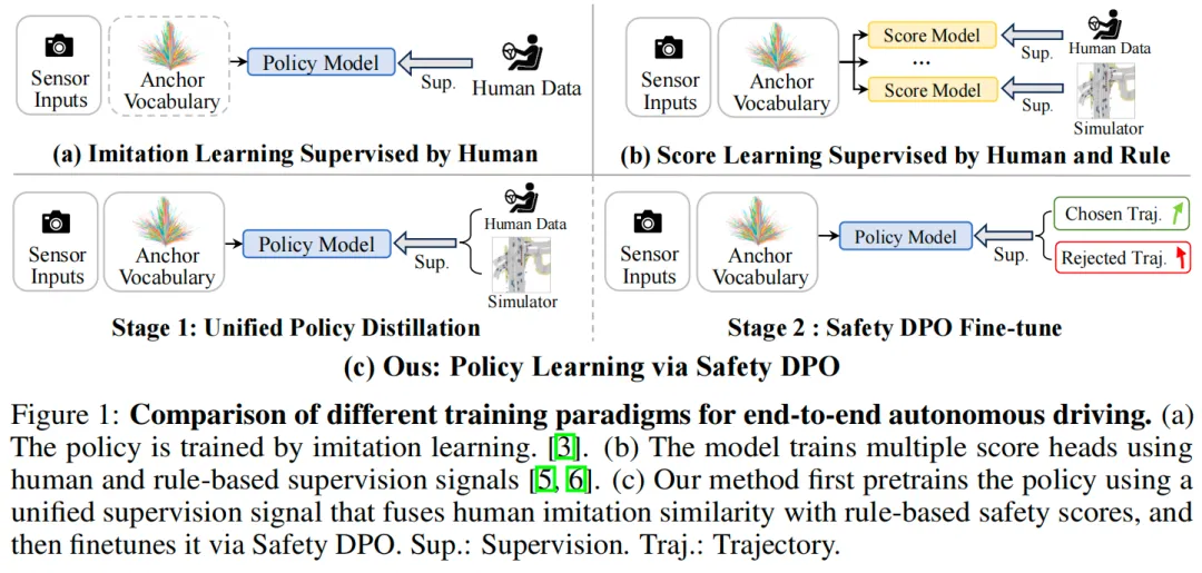 本文指出了端到端自动驾驶领域中模仿学习存在的关键安全挑战------此类模型往往会生成看似符合人类驾驶习惯、但实则存在安全隐患的轨迹。同时,本文还强调了现有基于分数的方法存在的局限性:这类方法将监督信号与策略学习相分离,无法实现对策略分布的直接优化。