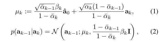 - 生成:未来场景(联合目标动作)是从随机高斯噪声开始生成的,随后,每个扩散步骤k涉及从下面指定的过程进行采样。其中,以及是根据预先确定的噪声得到的。通过迭代地反转扩散步骤,我们获得最终的去噪联合动作输出。随后,通过使用动态模型将目标动作转换为状态。该状态包括目标的坐标、朝向和速度。