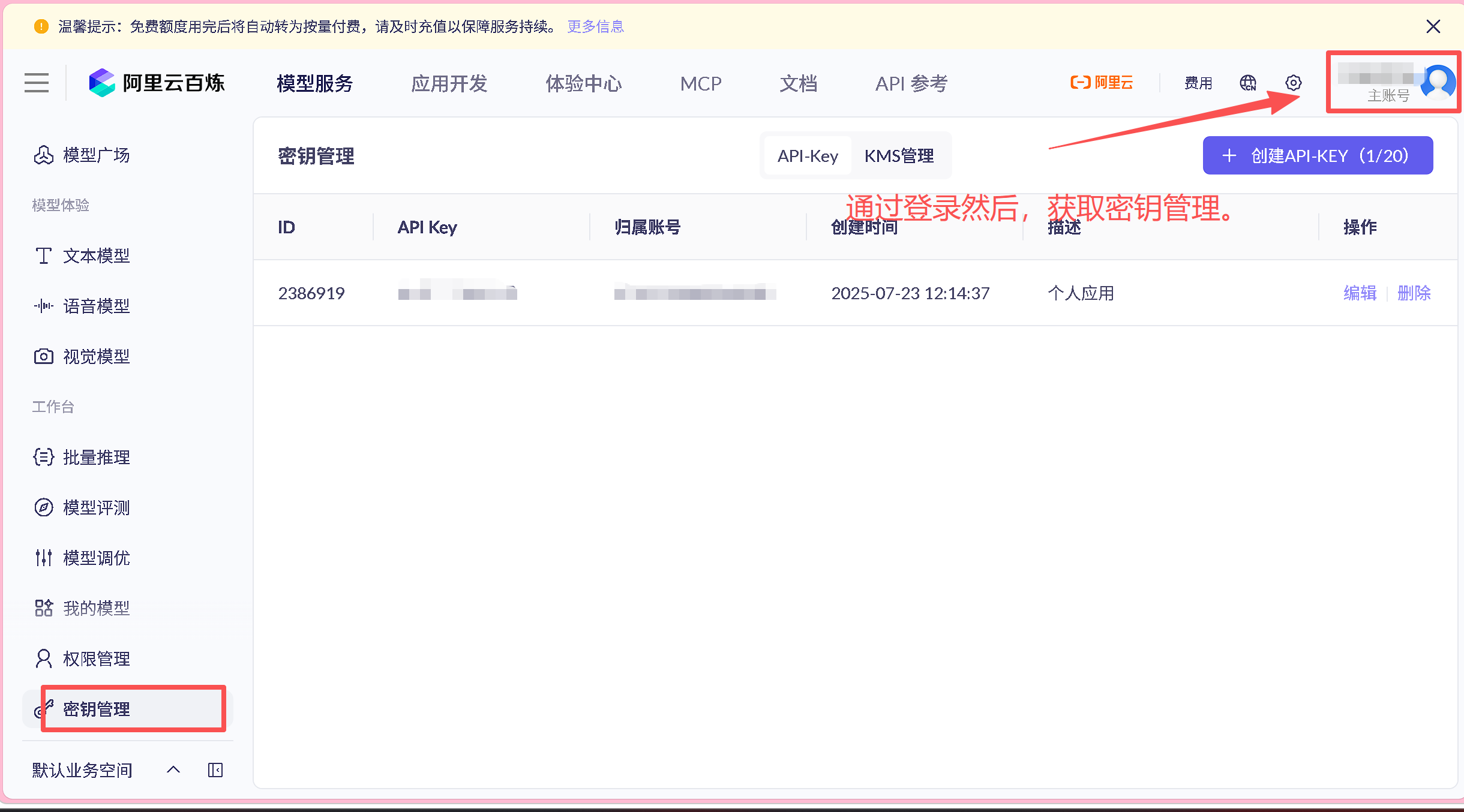 我们首先要想使用SSA的话,首先我们需要接入阿里百炼平台的通义模型https://bailian.console.aliyun.com
