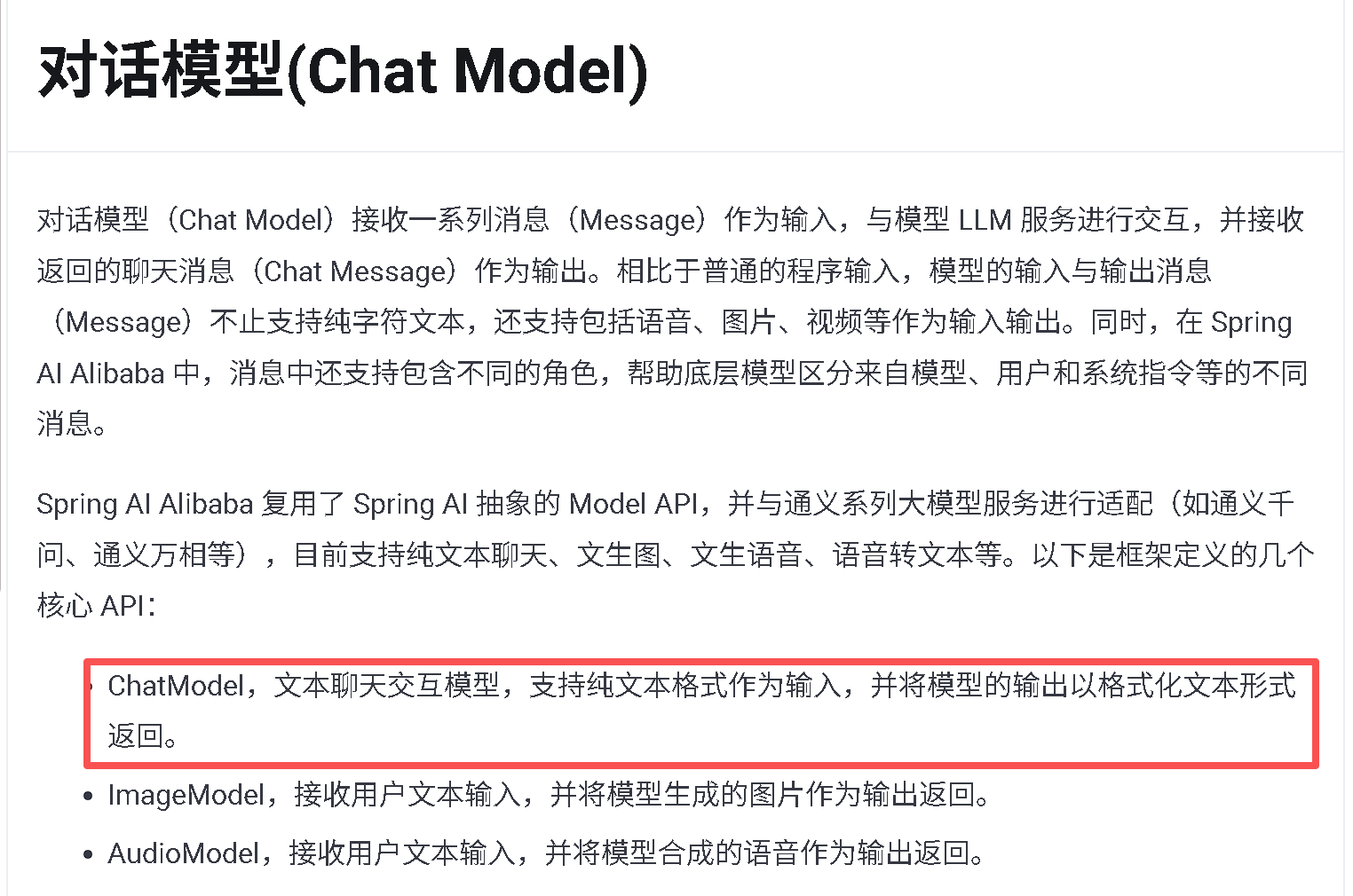 我们进行设置之后,就可以将我们的配置文件里面的值进行替换掉,这样更加的安全。当我们设置好之后现在我们就可以开始调用大模型了,但是我们怎么进行交互呢,对于和大模型进行对话交互我们可以使用ChatModel接口进行使用。我们在学习文档里面就可以找到,我们只进行对话的交互,所以我们使用ChatModel即可
