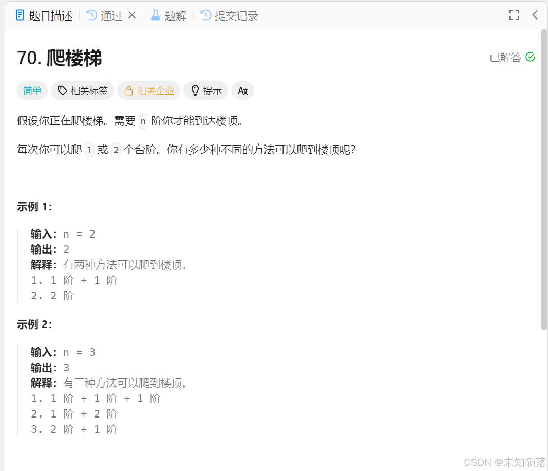 对于这道题,我们发现到达楼顶可以分为两部分,在楼顶的前一个位置跳一步到达,在楼顶的前两个位置跳两步到达,所以我们可以设一个方程来表示