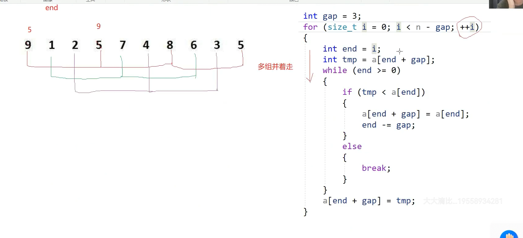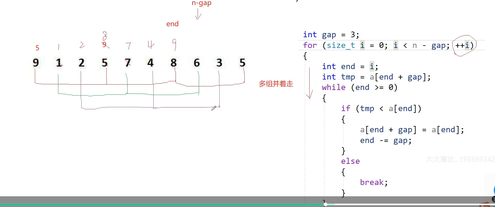 gap等于1右边就是直接插入排序。三组:i=0排红 1绿