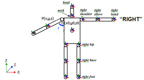 面向感应器,三维坐标在扫描画面的左下角,以人体画面左边手臂为参考; 手从竖直立正抬至P状态为动作过程分析,r为与身体初始位置时的角度; 每一帧获取到的r值随运动改变,舵机也将即时改变角度;