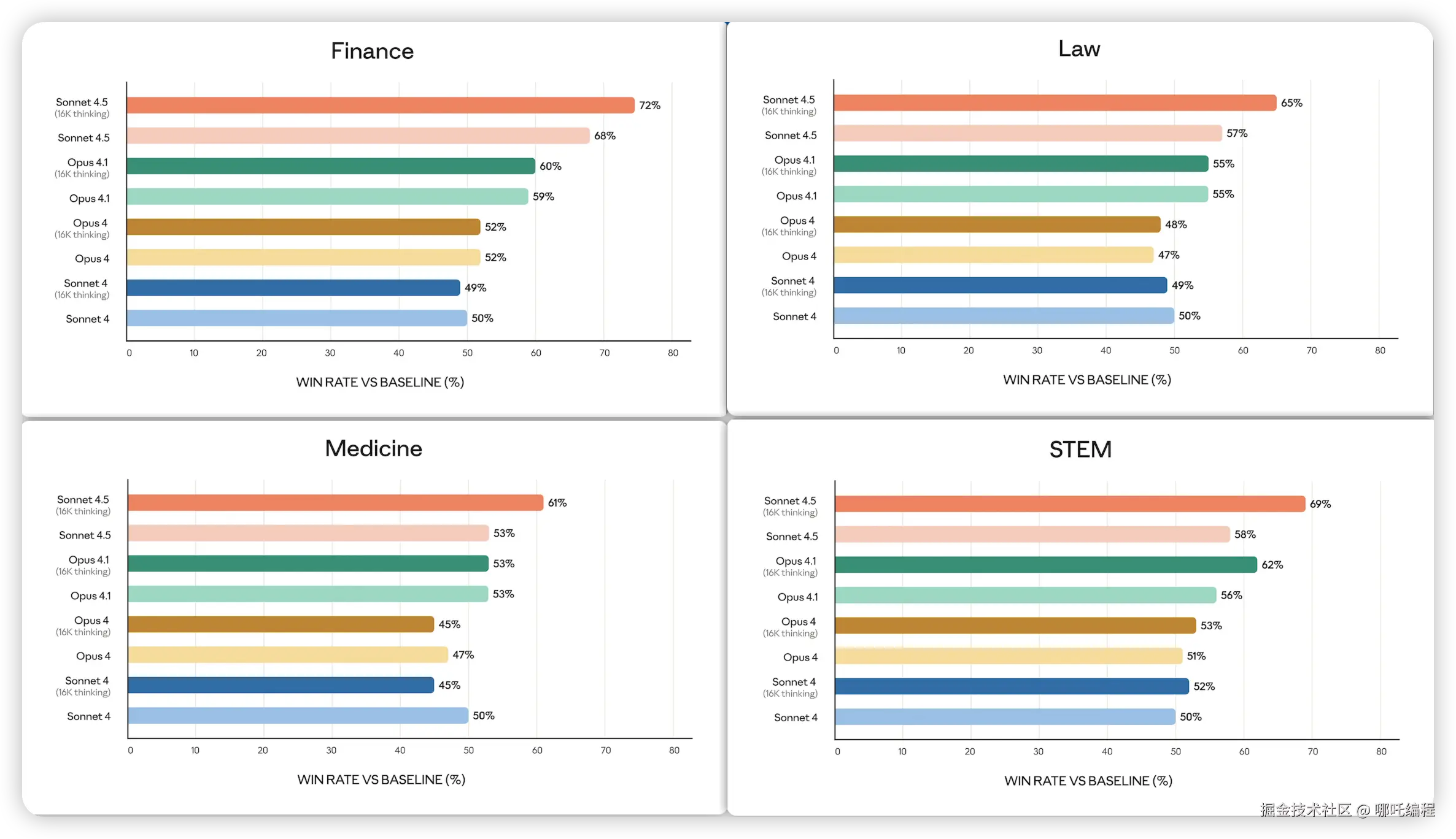 Sonnet 4.5 在 金融(Finance) 领域的胜率高达 72%,在启用长思维链 (16k thinking) 模式下依旧保持 68%,显著领先其他模型。在 法律(Law) 领域,Sonnet 4.5 取得 65% 的成绩,明显超过 Claude Opus 4.1 的 55% 和 Sonnet 4 的 50%。