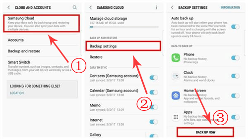 - **备份:**进入三星手机的"设置">"云和账户">"三星云">"备份设置"(如果需要,登录三星账户)。然后点击"立即备份"。