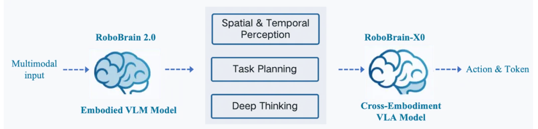 RoboBrain-X0 源自 RoboBrain 的多模态基座能力,在 RoboBrain 2.0 数据基础上,进一步融合了真实机器人动作数据。通过统一建模视觉、语言与动作,它实现了跨本体的泛化与适配,具备从感知到执行的一体化能力。