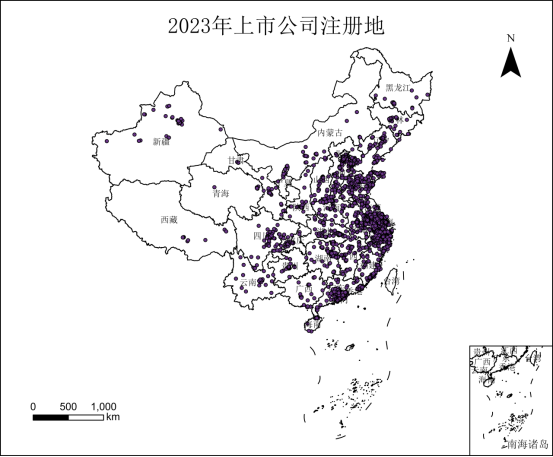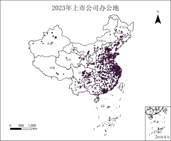 本文将Excel数据进行可视化表达,将其转换成Shp格式文件,下图为2023年上市公司注册地和办公地的可视化示例: