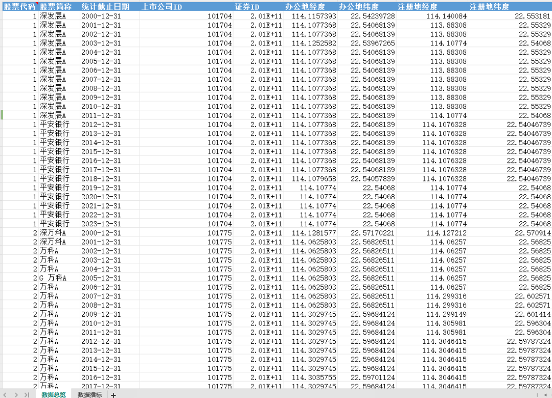 今天带来的数据是2000-2023年的全国上市公司的注册地、办公地、股票代码、股票简称、上市公司ID、证券ID数据,并对其进行了可视化处理,方便大家研究使用。