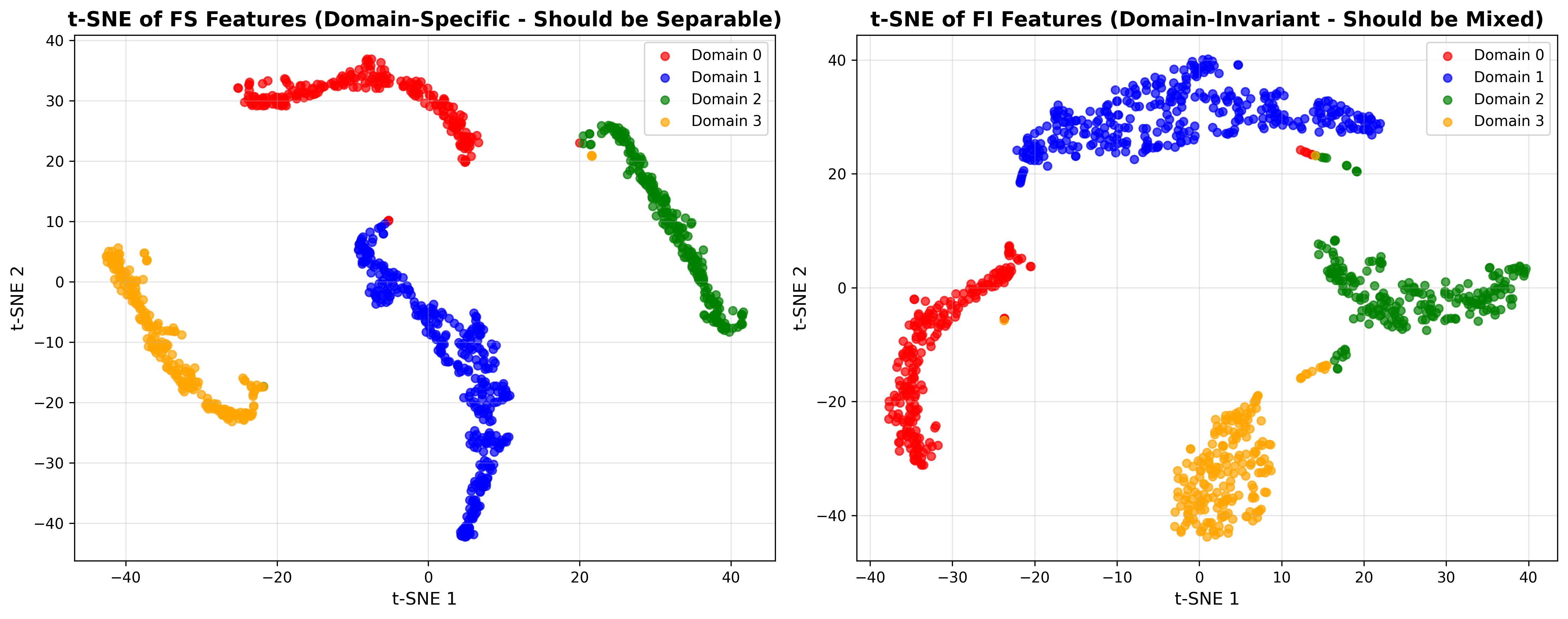- 可视化要求:t-SNE 左图(fs)明显可分,右图(fi)明显混合;并给出分离度指标(如轮廓系数与分离比)。