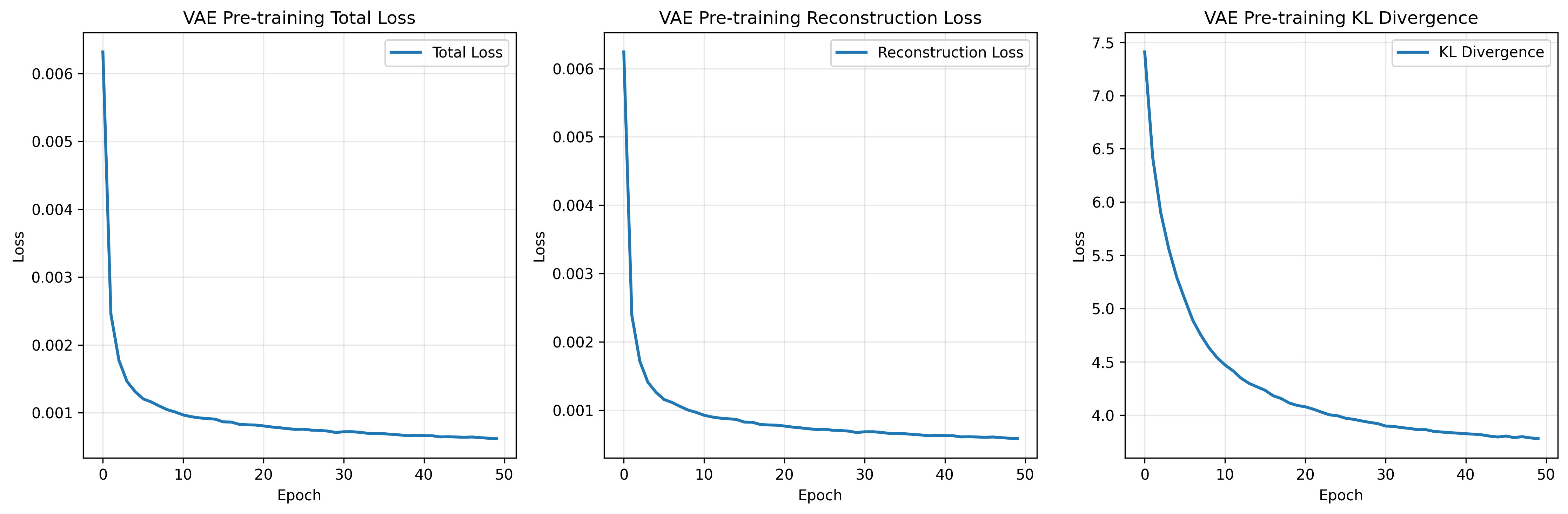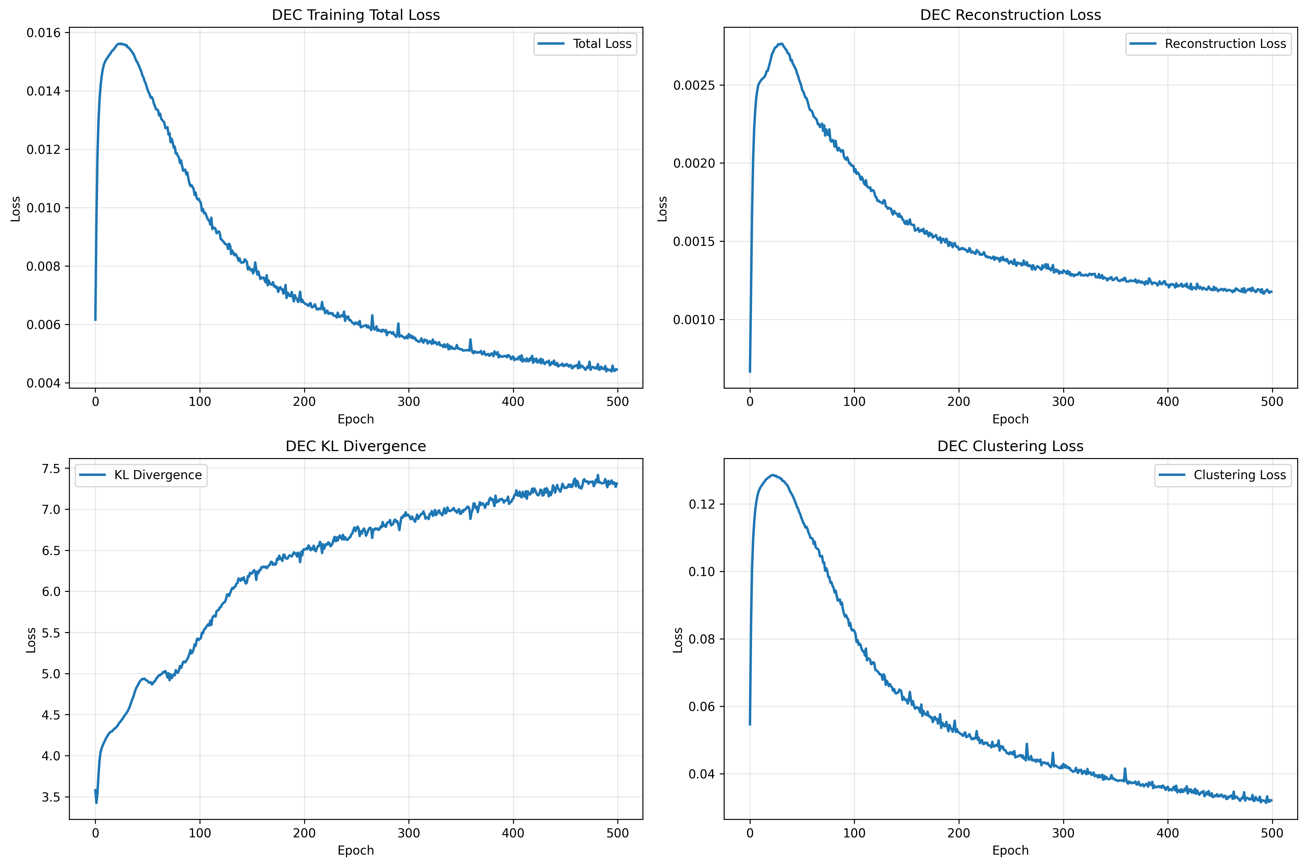 - 启动流程:先预训练VAE,再进行DEC聚类并提取软标签,最后进入主训练。