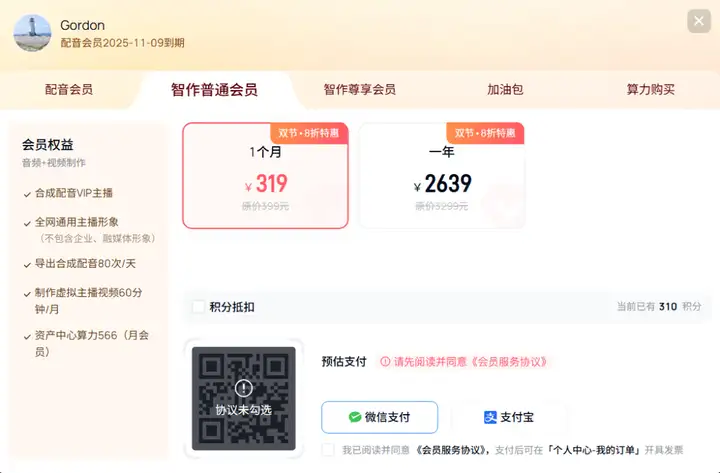 讯飞智作提供导入PPT,设置培训、宣传、教育教学等多个场景,几十个形象好、气质佳的数字人可选,同时还可以实现一键配音、自动生成字幕,设置尺寸、分辨率、语音换气、连读和停顿等,科技感满满。但是,使用导出视频功能就得支付319元/月的会员费,而且这个价格还是打过折的价格。