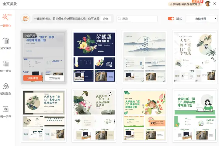 第三步,这个PPT生成的效果还不错,只是图片搭配一般,此时可以通过WPS------【会员专享】------【全文美化】对PPT的模板、布局进行修改。