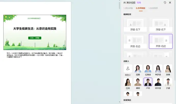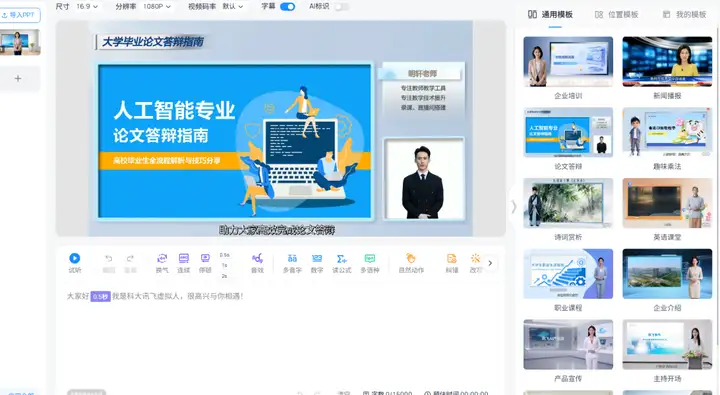 第七步,设置视频框架,选择讲解人,预览效果无误后就可以生成视频了。生成5分钟视频大约要六七分钟的样子。目前,此项功能属于限时免费的状态,大家可以多多尝试一下。