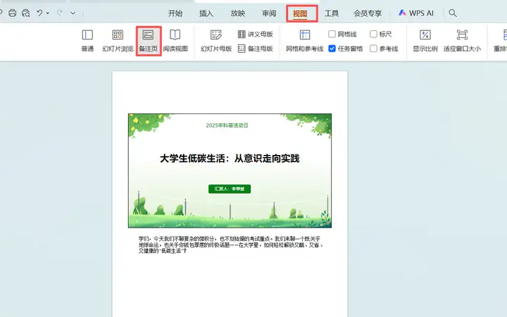 第五步,打开刚才制作的PPT,把讲解词拆分,并放到每一页的备注中,如下图所示。