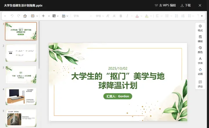 第二步 ,去灵犀http://lingxi.wps.cn,选择它的AI PPT功能,输入以下提示词,让它根据视频文案生成PPT,然后根据提示,选择合适的模板,一个课件雏形就制作好了。