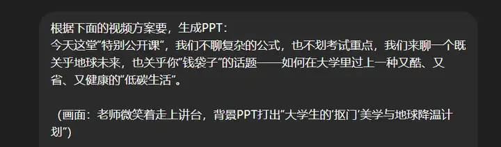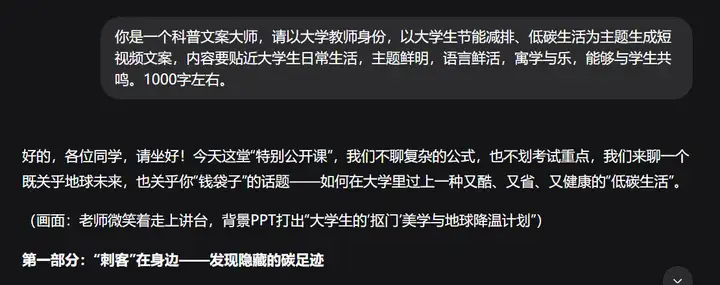 第一步,先去DeepSeek生成文案。输入你的提示词,拟定大模型的身份:科普文案大师、大学教师身份,阐明主题:节能减排、低碳生活,明确具体的要求和限制条件,这样生成的方案才更加精准。