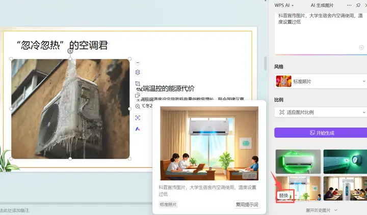 还可以通过【插入】------【图片】------【AI生成图片】,输入提示词,设置图片风格、比例,以便生成接近需求的图片。然后,选中PPT中的图片,再选择AI生成的图片,点击【替换】就可以替换原来PPT中的图片。