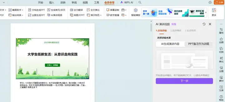第六步,依次点击【会员专享】------【AI演讲视频】,选择PPT备注作为讲稿,再点下一步,再确认一下每一步的讲稿内容,添加适当的衔接词。