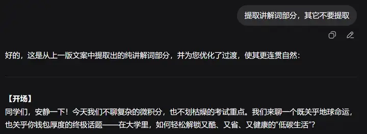 第四步,通过DeepSeek输入提示词,提取文案中的讲解词备用,如下图所示。