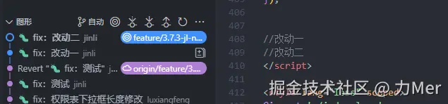从图片中可以看到我的操作是在代码中依次填入两行改动并进行了两次本地的提交(蓝色是本地仓库我的分支,紫色是远程仓库我的分支)。