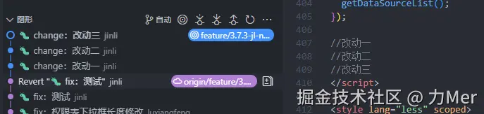从图片中可以看到我的操作是在代码中依次填入三行改动并进行了三次本地的提交(蓝色是本地仓库我的分支,紫色是远程仓库我的分支)。