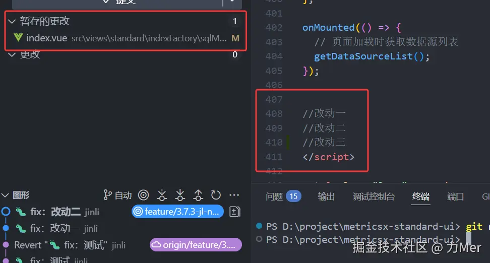 可以看到把改动一和改动二的提交给撤销了,但是在改动区保留了这两次提交的改动。