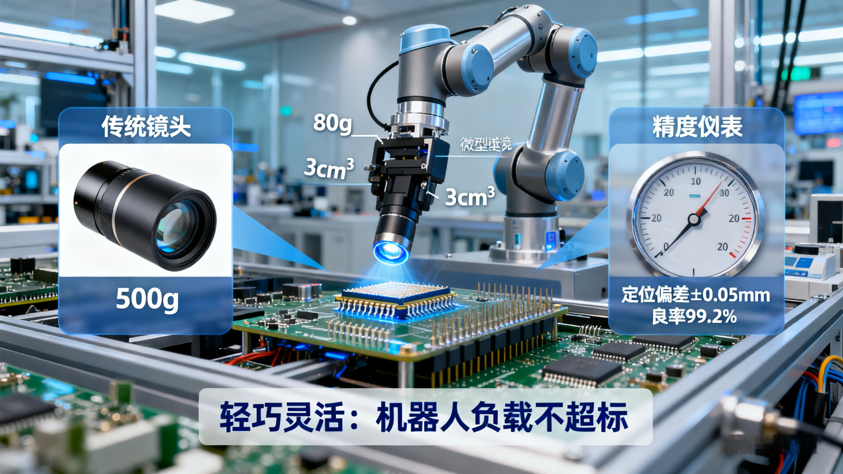 - 痛点:协作机器人(负载<5kg)装传统镜头(500g+),负载超支导致定位偏差从±0.05mm增至±0.1mm,装配良率低。