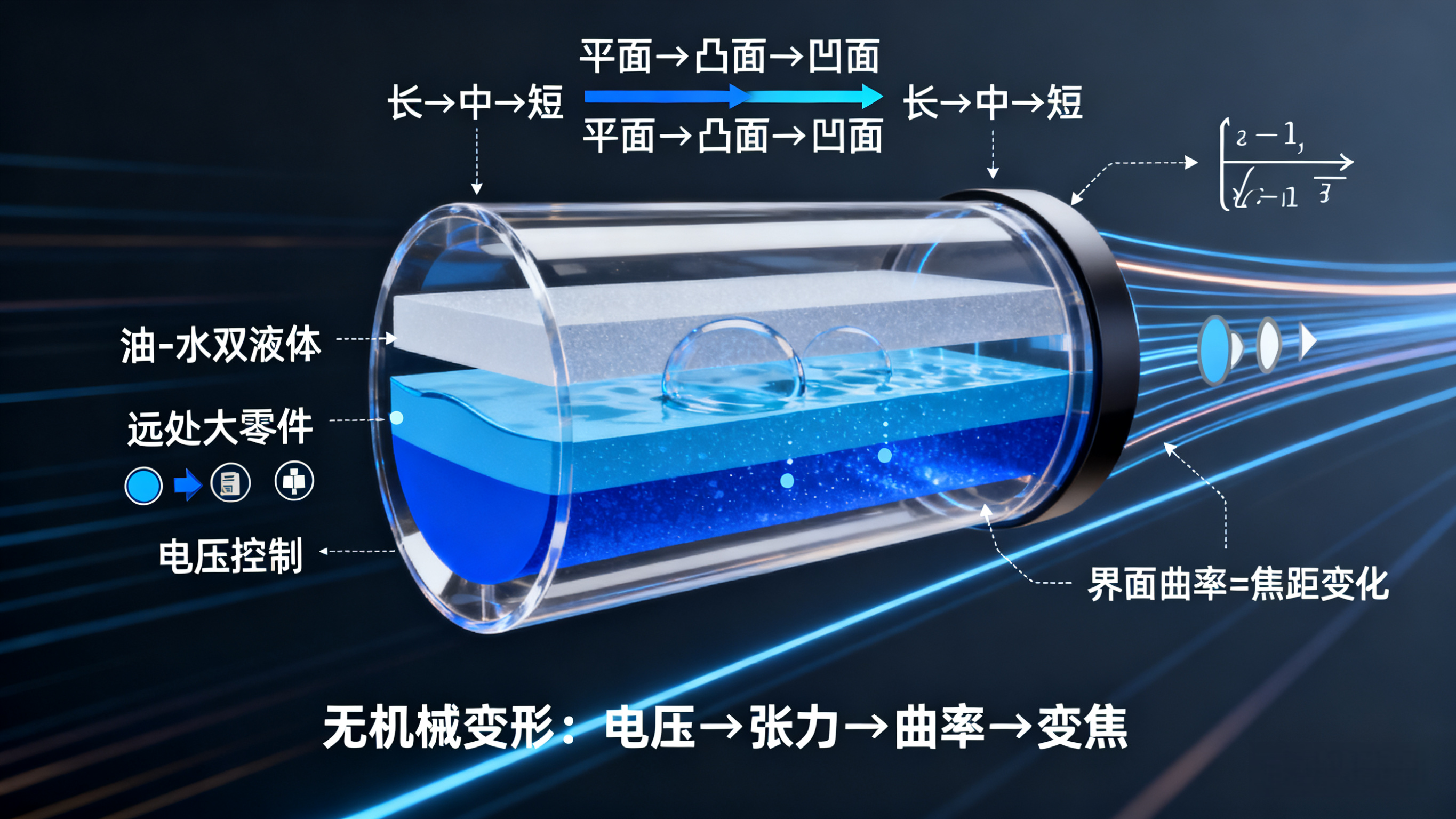 - 核心结构:密封腔体内装两种"不相溶的透明液体"(如油和水),液体折射率不同,类似"液体版镜片"。