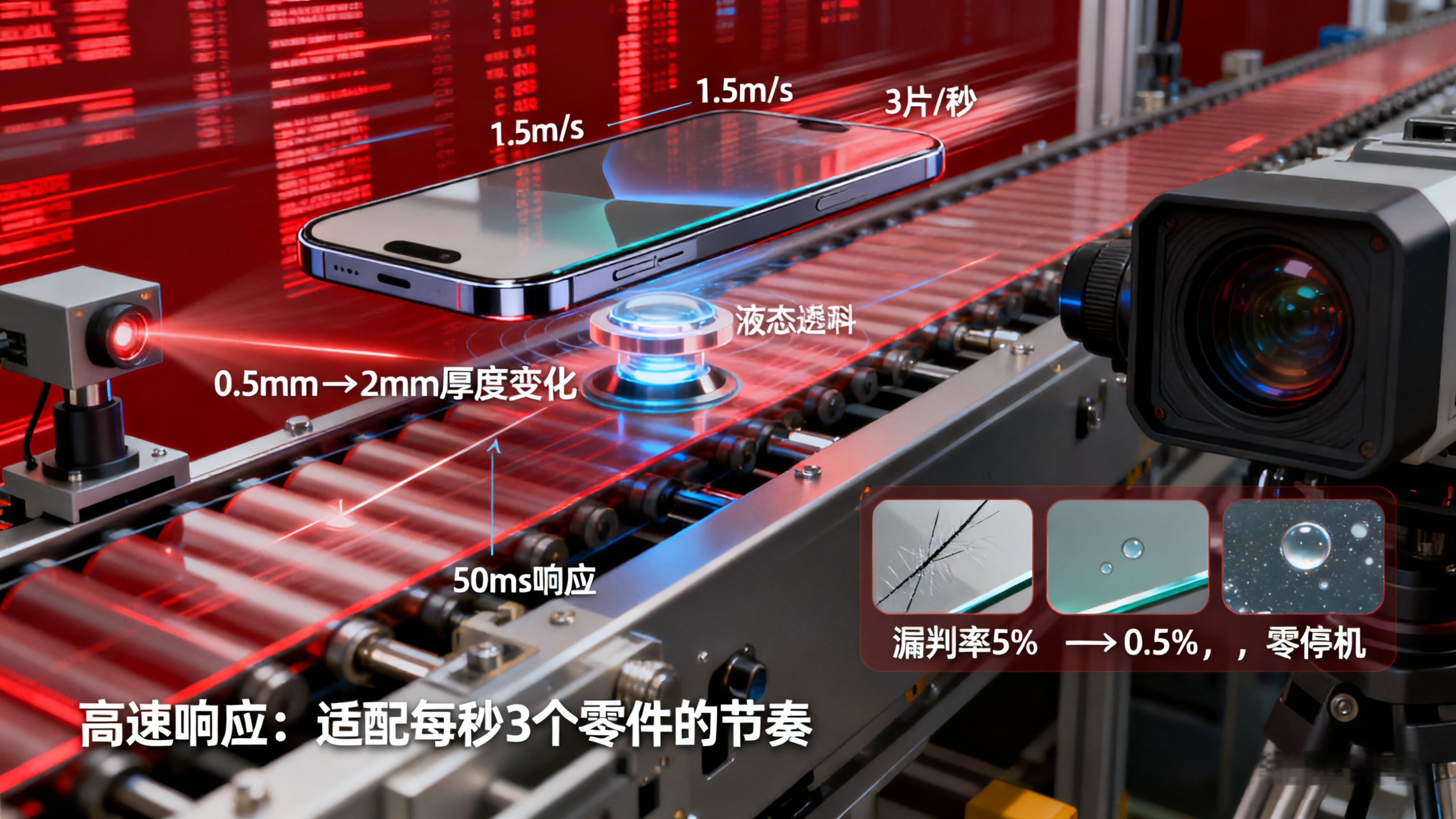 - 痛点:手机玻璃流水线(1.5m/s,每秒3片),玻璃厚度0.5-2mm,传统固定焦距漏判率5%,停机调焦损失大。