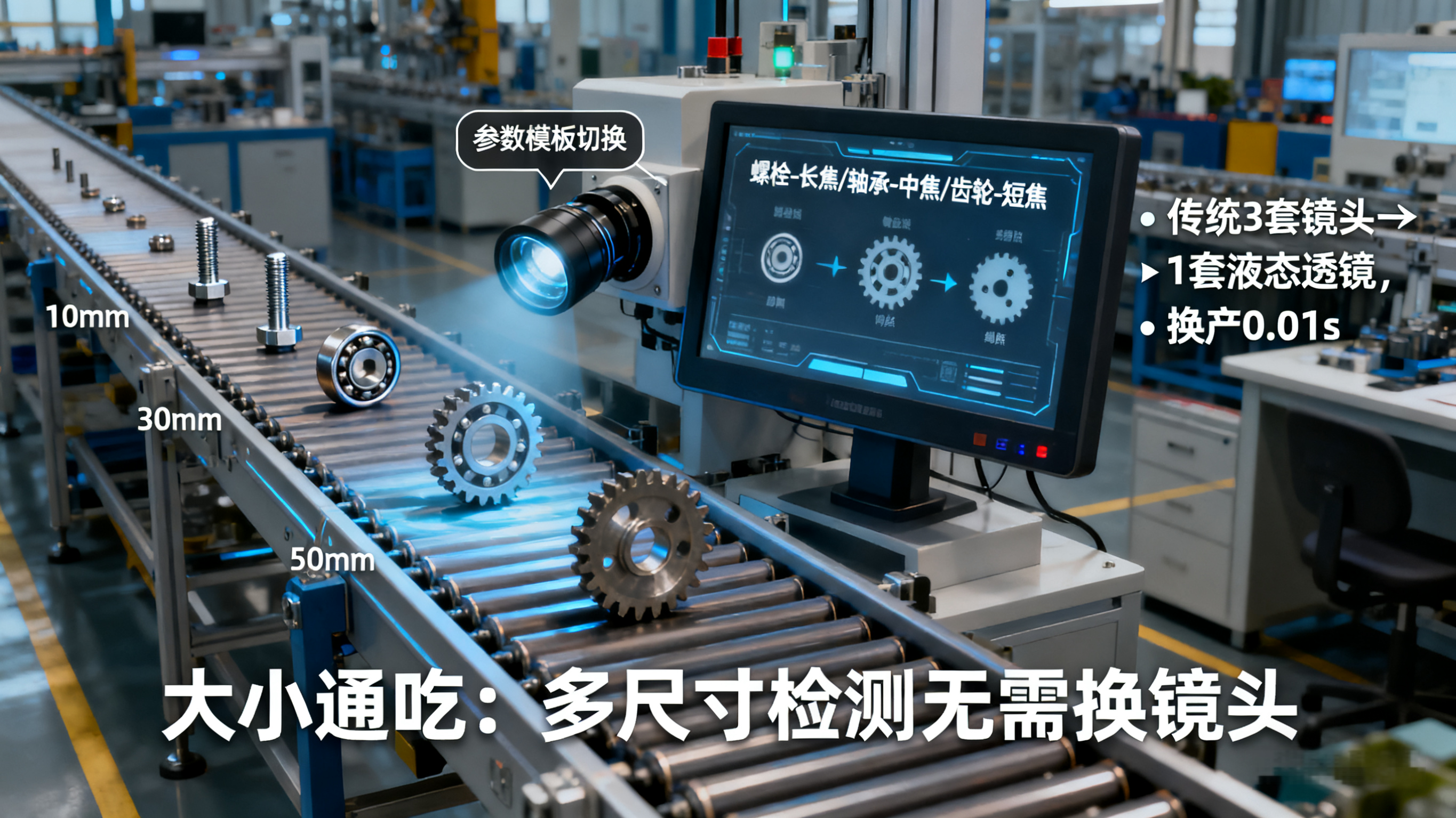 - 方案:液态透镜+软件参数模板,测不同尺寸零件时一键调用模板,10毫秒完成变焦,无需拆镜头。
