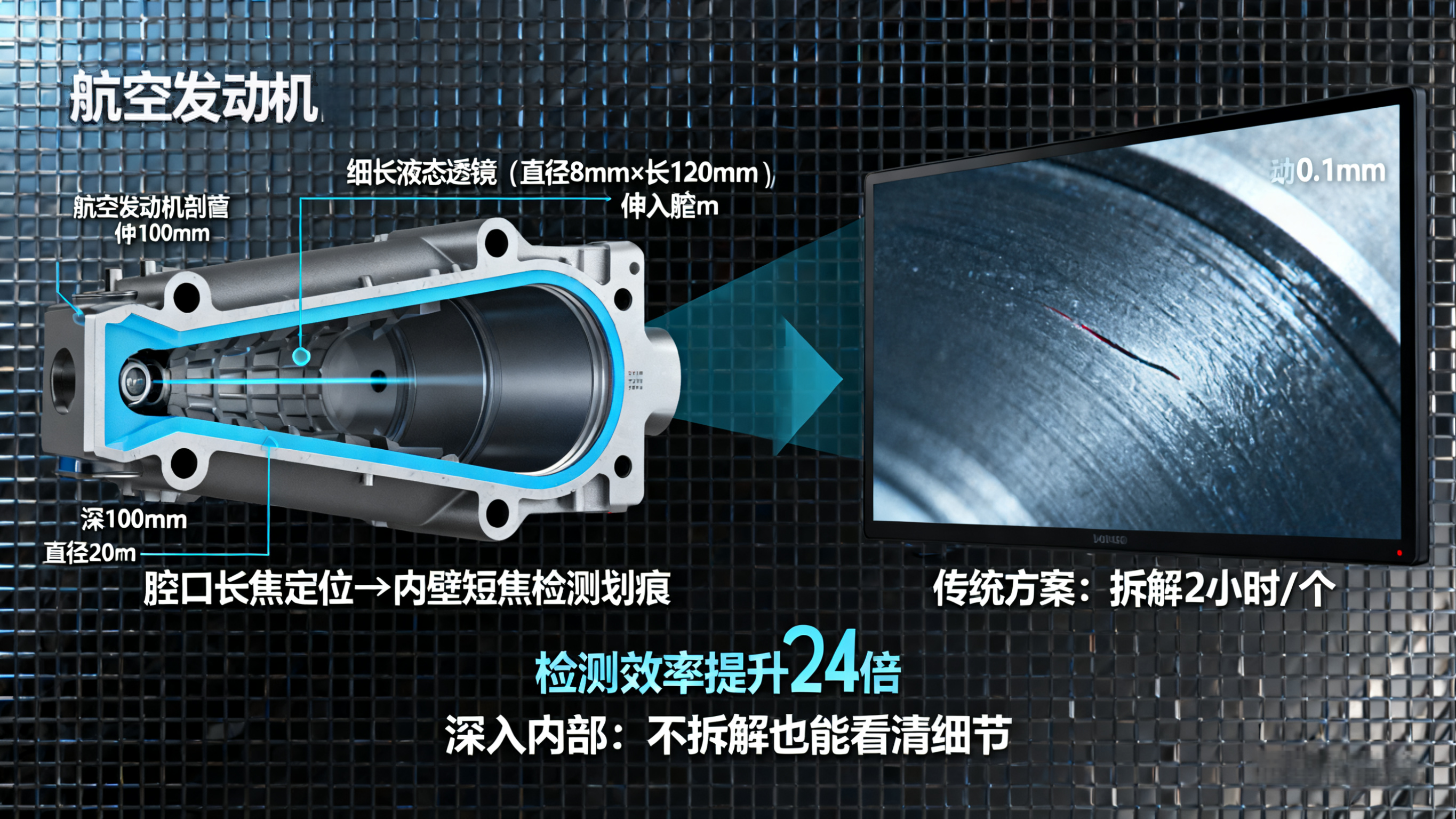 - 痛点:航空发动机深腔零件(深100mm、直径20mm),传统镜头要么伸不进、要么看不清,拆解检测需2小时/个。