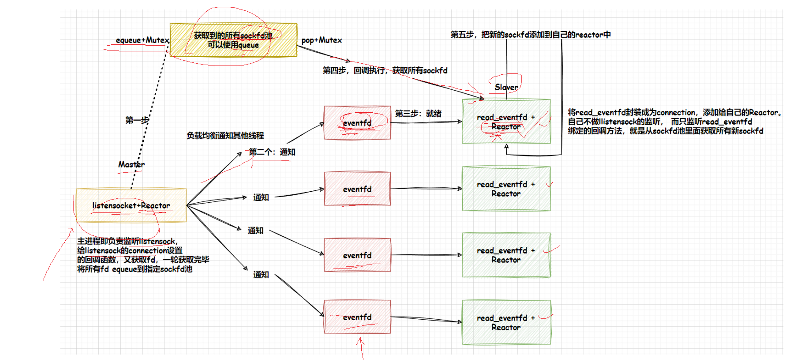 1)主线程有一个Reactor,内部有listensock;创建一批线程,通过eventfd进行唤醒(负载均衡),各自有各自的Reactor