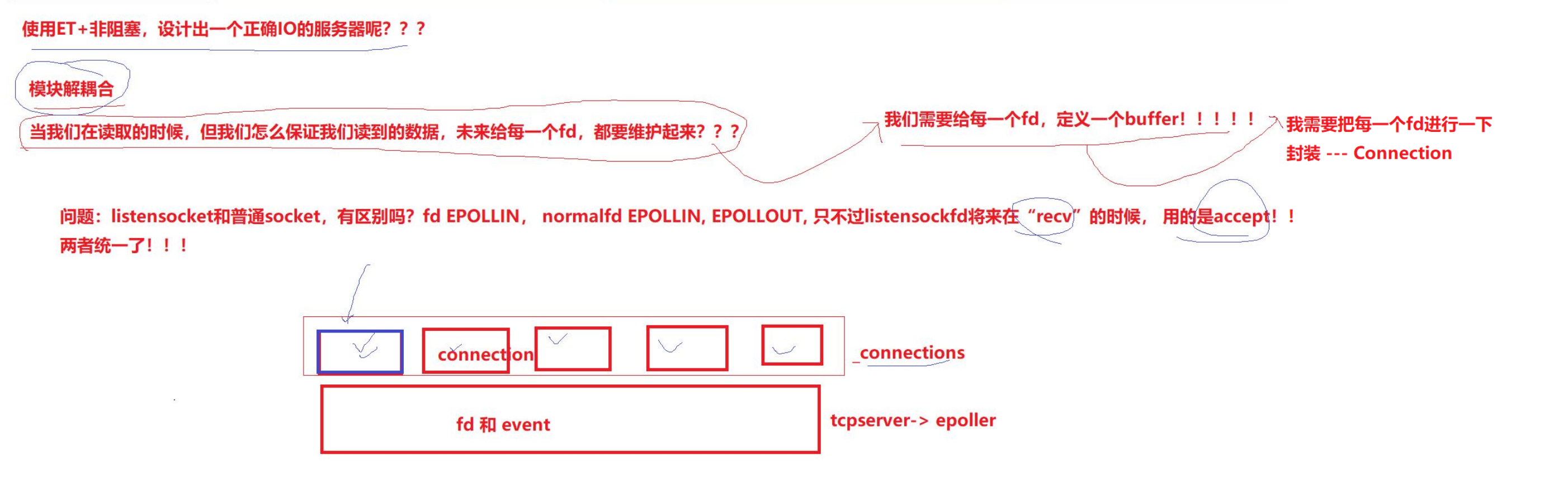 读取的时候要保证读取的数据来自对应的fd,发过来的报文即使读完了(ET模式必须读完)也大概率不是完整的(TCP面向字节流),但这个报文又不能丢,必须存着 -> 因此给每个fd,定义收发缓冲区 -> 把每个fd封装一下 --- Connection