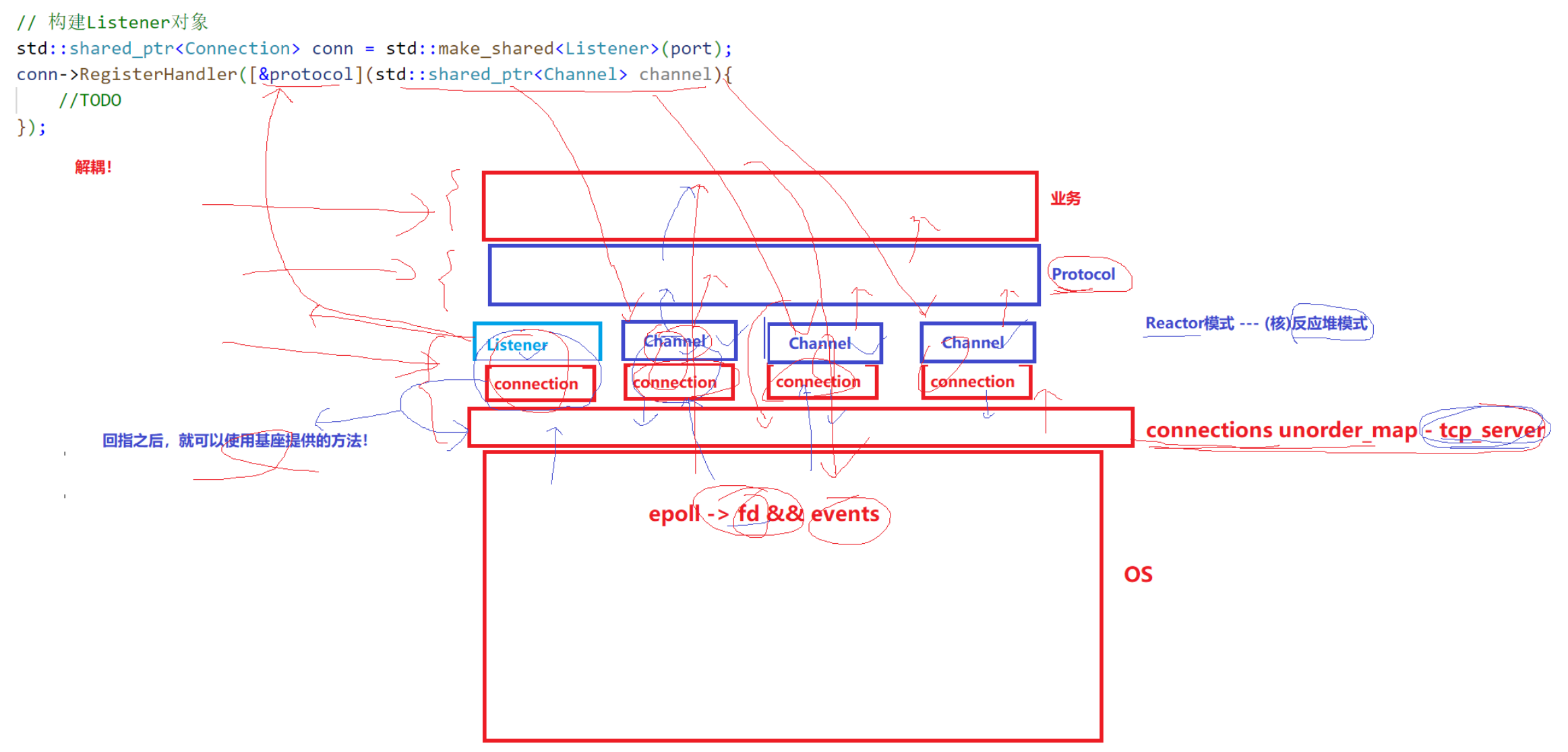 每个Connection内部都有一个Reactor类型的回指指针,便于操作_connections 和 _epoll_ptr进行用户和内核的数据修改。